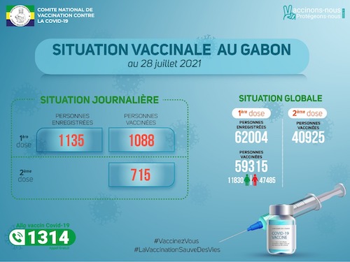 En ce qui concerne la vaccination, 26 centres sont ouverts dans les provinces de l’Estuaire, de l’Ogooué-Maritime, du Haut-Ogooué, de l’Ogooué-Lolo, de la Nyanga, de la Ngounié, du Moyen- Ogooué, de l’Ogooué-Ivindo et du Woleu-Ntem. Il y a eu 1803 vaccinés aujourd’hui parmi lesquels 715 ont reçu la 2ème dose et 1088 la 1ère dose.