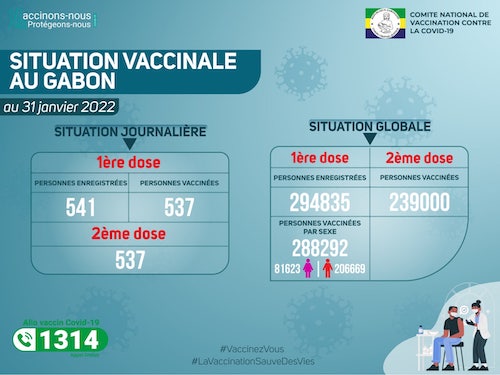 En ce qui concerne la vaccination, 86 sites sont ouverts dans les provinces de l’Estuaire, de l’Ogooué-maritime, du Haut-Ogooué, de l’Ogooué-Lolo, de la Nyanga, de la Ngounié, du Moyen- Ogooué, de l’Ogooué-Ivindo et du Woleu-Ntem, parmi lesquels 55 sites fixes et 38 sites en stratégie mobile dont 13 au sein des entreprises privées et 25 dans les administrations publiques.