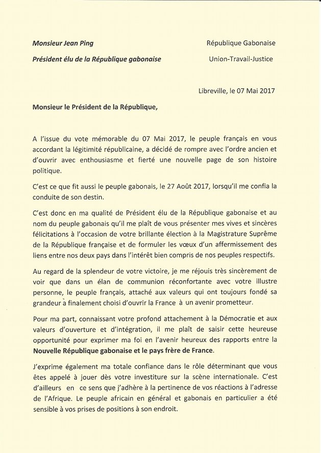 GABON /FRANCE : Jean PING félicite Emmanuel MACRON