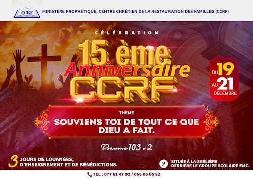 À l’occasion de cet anniversaire, le CCRF organise un grand événement spirituel inédit, du vendredi 19 au dimanche 21 décembre 2025, dans les locaux de l’église situés à la Sablière, derrière le Groupe scolaire EMC, à Akanda.