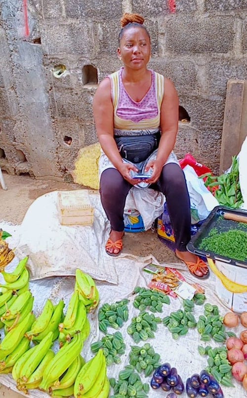 Sur son étal bien ordonné, Evelyne propose des produits frais et variés  : bananes plantains, gombos, légumes verts, aubergines et oignons. «  Je tiens à offrir le meilleur à mes clients, car ce qu’ils achètent nourrit leurs familles  », explique-t-elle avec passion. Derrière son sourire se cache une femme résolue à bâtir un avenir meilleur malgré les contraintes.