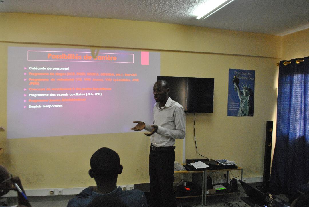 Max Axel Bouda, le premier intervenant, a essentiellement communiqué sur les opportunités d’emplois et de stages qu’offre le système des Nations-Unies à travers ces différentes agences et bureaux spécialisés. Il a entretenu l’assistance sur les profils recherchés avant d’aborder les opportunités de carrière à travers les programmes de volontariat, de stage et de jeune administrateur.