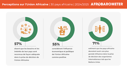 Les données de 30 pays africains montrent qu’une majorité d’Africains estiment que les besoins et les intérêts de leur pays sont suffisamment pris en compte dans les décisions de l’Union Africaine (UA) et de leurs organisations économiques régionales (par exemple, la Communauté de Développement de l’Afrique Australe, la Communauté Economique des Etats de l’Afrique de l’Ouest, la Communauté de l’Afrique de l’Est et l’Union du Maghreb Arabe).