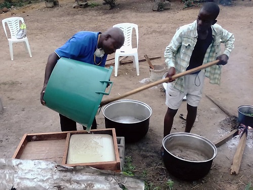 Il faut déjà 4 litres d’eau avec un litre de soude caustique, c’est le produit chimique qui détient tout le mystère du travail à fournir. La mixture prend 6h .Après il faut prendre 8 litres d’huile de palme à chauffer jusqu’à éclaircissement. Le mélange à la soude caustique diluée à l’eau.