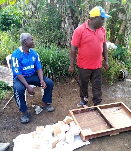 Le mélange se fait minutieusement avec l’œil sur la montre, car il faut verser toutes les 2mn dans la bassine d’huile de palme, cette étape dure une heure, et toujours en remuant jusqu’à obtenir une patte à laquelle on ajoute du colorant au choix." On a pris le bleu parce qu’on veut du savon bleu" explique le pasteur Makosso. La patte est versée dans un moule artisanal. Trois jours, le bloc est découpé selon les dimensions de savon voulues. "Au début, c’était compliqué" confie un apprenti.