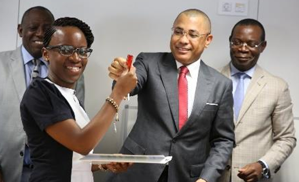 Akanda, le 05 février 2016 – Le Ministre de l’urbanisme et du logement, Monsieur Désiré Guedon, a remis symboliquement aujourd’hui aux premiers attributaires du programme des 13 700 logements sociaux en cours de construction la clé de leur nouveau logement.