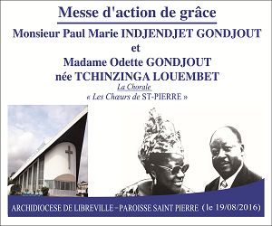 Une messe d’action de grâce en hommage à Monsieur Paul Marie INDJENDJET GONDJOUT et Madame Odette GONDJOUT née TCHINZINGA LOUEMBET aura lieu de Vendredi 19 Août 2016 à 18h30 (...)