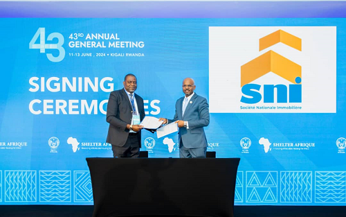 Après des mois de négociations et une visite à Libreville de la délégation de la Banque de dévéeloppement Shelter Afrique, dirigée par Edmond Adjikpé, des accords ont été signés à Kigali le 11 Juin 2024 entre Hermann Kamonomono, Directeur Général de la Société Nationale Immobilière, et Habob-Tthiam Hann, Directeur Général de la Banque de Développement Shelter Afrique