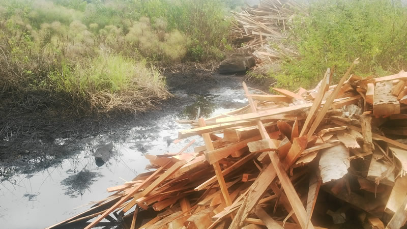 C’est le cas à Lambaréné, où des opérateurs économiques contribuent à la dégradation de l’environnement. Sur la rive opposée du marché Isaac, à seulement une centaine de mètres de l’Ogooué, une scierie entasse des bois usés et un tuyau provenant d’une usine de traitement de la SEEG déverse de l’huile. L’huile versée s’est répandue un peu partout et forme maintenant un petit étang à proximité du fleuve. Un véritable danger pour les populations, car tout ceci se passe à proximité du fleuve d’où la SEEG puise l’eau qui est redistribuée aux consommateurs. La scierie jointe à la SEEG semble clairement complice puisqu’elle recouvre régulièrement les lacs d’huile déversée par SEEG de terre et de sable, ceci afin de cacher la pollution.