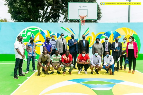 Accompagné d’une délégation, le ministre Franck Nguema a visité proprement le travail effectué dans cet emplacement et a tenu à « checker » une balle dans le panier de basket-ball. À ses côtés, se trouvait Jeanne Ngobele, la Mairesse du 3ème arrondissement de Libreville, à qui le ministre en charge des Sports a d’ailleurs officiellement octroyé la charge des clés dudit terrain sportif.