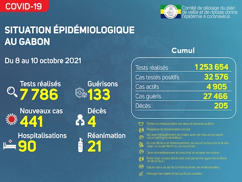 Nous avons enregistré 441 nouveaux cas positifs sur 7 786 tests réalisés, soit un taux de positivité de 5.7%, 90 personnes hospitalisées dont 21 en réanimation pour détresse respiratoire, 133 nouvelles guérisons et 04 nouveaux décès dont 03 à Libreville et 01 à Oyem.