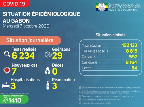 -Estuaire : 7 nouveaux cas positifs sur 6 234 prélèvements à Libreville, soit un total de 6 238 cas confirmés.Concernant la prise en charge :
