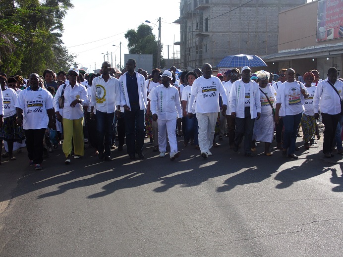 Gabonews : Samedi 1er novembre, il est 14h45 quand le carrefour ‘’Joseph Rendjambé’’ communément appelé ‘’ carrefour Château’’ est bondé de monde, des gens vêtus de tee shorts blancs sur lesquels, on lisait « Touche pas mon Président, Ya ’Ali ». C’est l’un des points chauds de la ville de Port-Gentil, capitale économique à forte activité sociopolitique lorsque l’oblige l’actualité. Les marcheurs vont braver les aléas du temps : le soleil. Ils ont avalé plus de 2km à pieds. Au fur et à mesure qu’ils évoluent d’autres riverains grossissent les rangs. « Je me joins à cette association pour m’opposer à ceux qui disent n’importe quoi sur notre président » confie Charlotte.